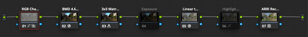 Much the same as LUT version, avoid making any adjustments prior to the first node as this will affect the transform’s accuracy. Limit any pre LUT adjustments to just temperature and tint. I would also stick to ISO800 and use the gain wheel in the Exposure Node 04 to do accurate fully corrected exposure adjustments. Any other corrections or creative grading should take place after Node 05.